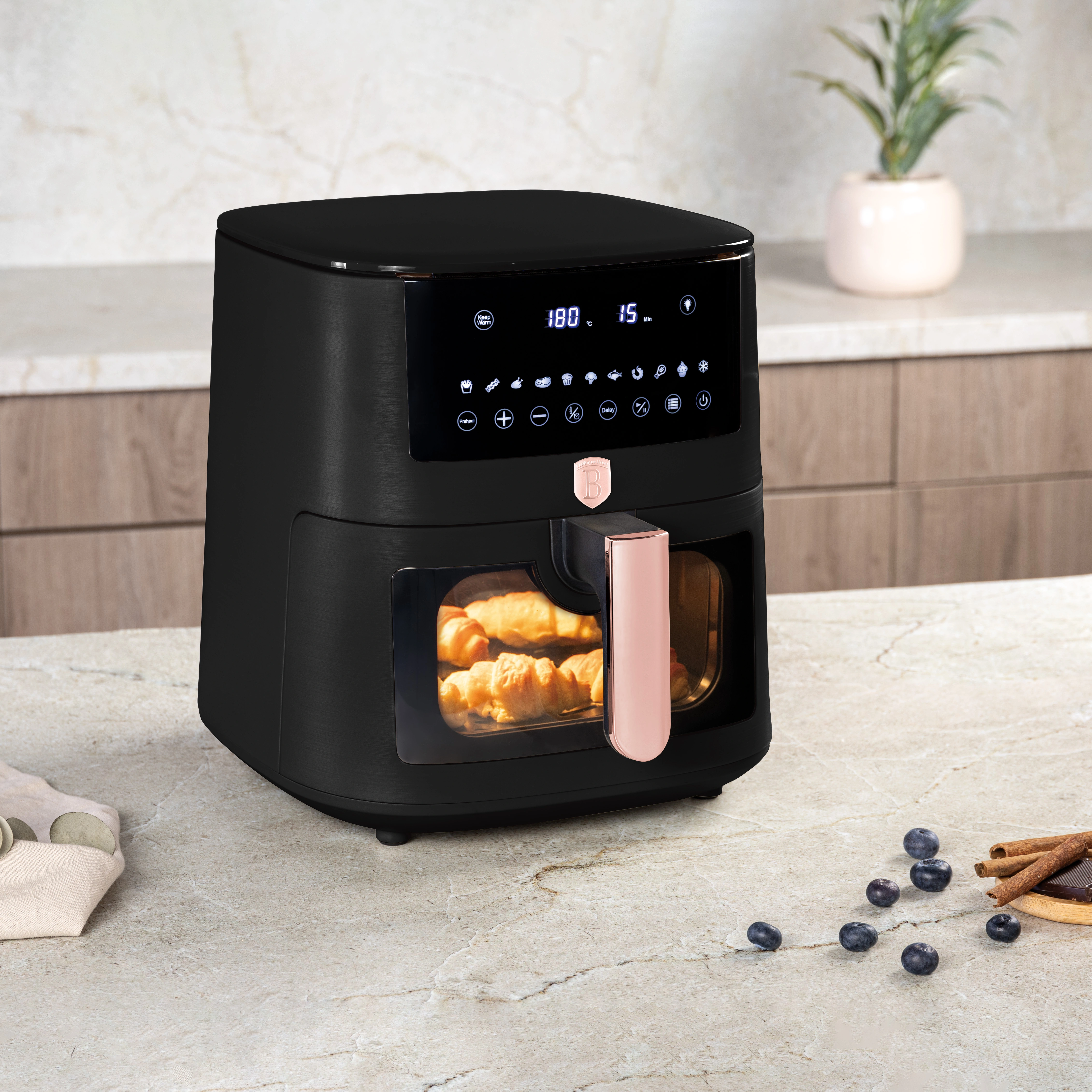 Czarno–różowo–złote wykończenie oraz elegancki dotykowy panel sprawiają, że urządzenie wyróżnia się na kuchennym blacie, dodając każdemu wnętrzu luksusowego charakteru.