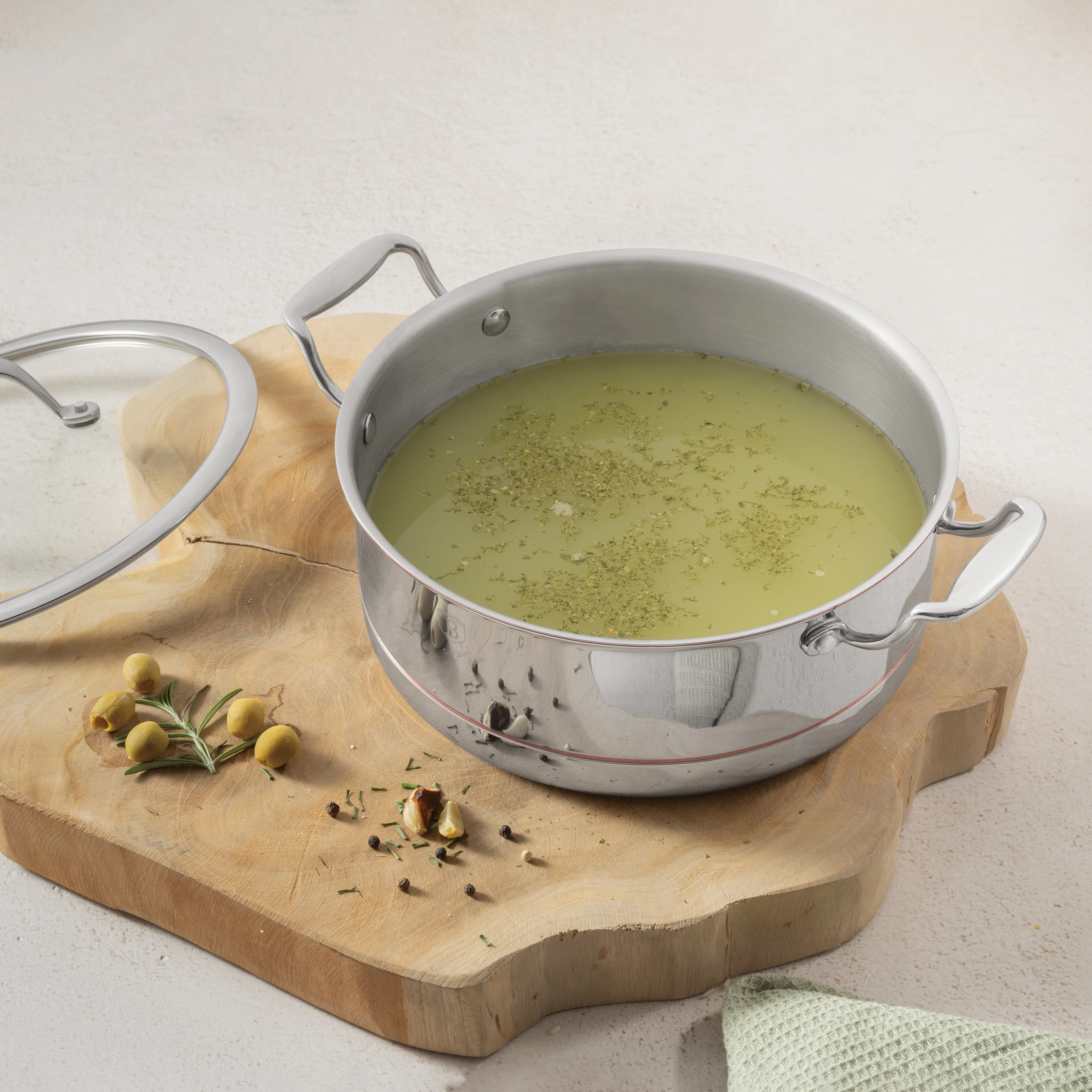W zestawie znajduje się pokrywka z hartowanego szkła T-glass z obręczą ze stali nierdzewnej oraz otworem odpowietrzającym, umożliwiającym kontrolę potraw bez konieczności jej zdejmowania.