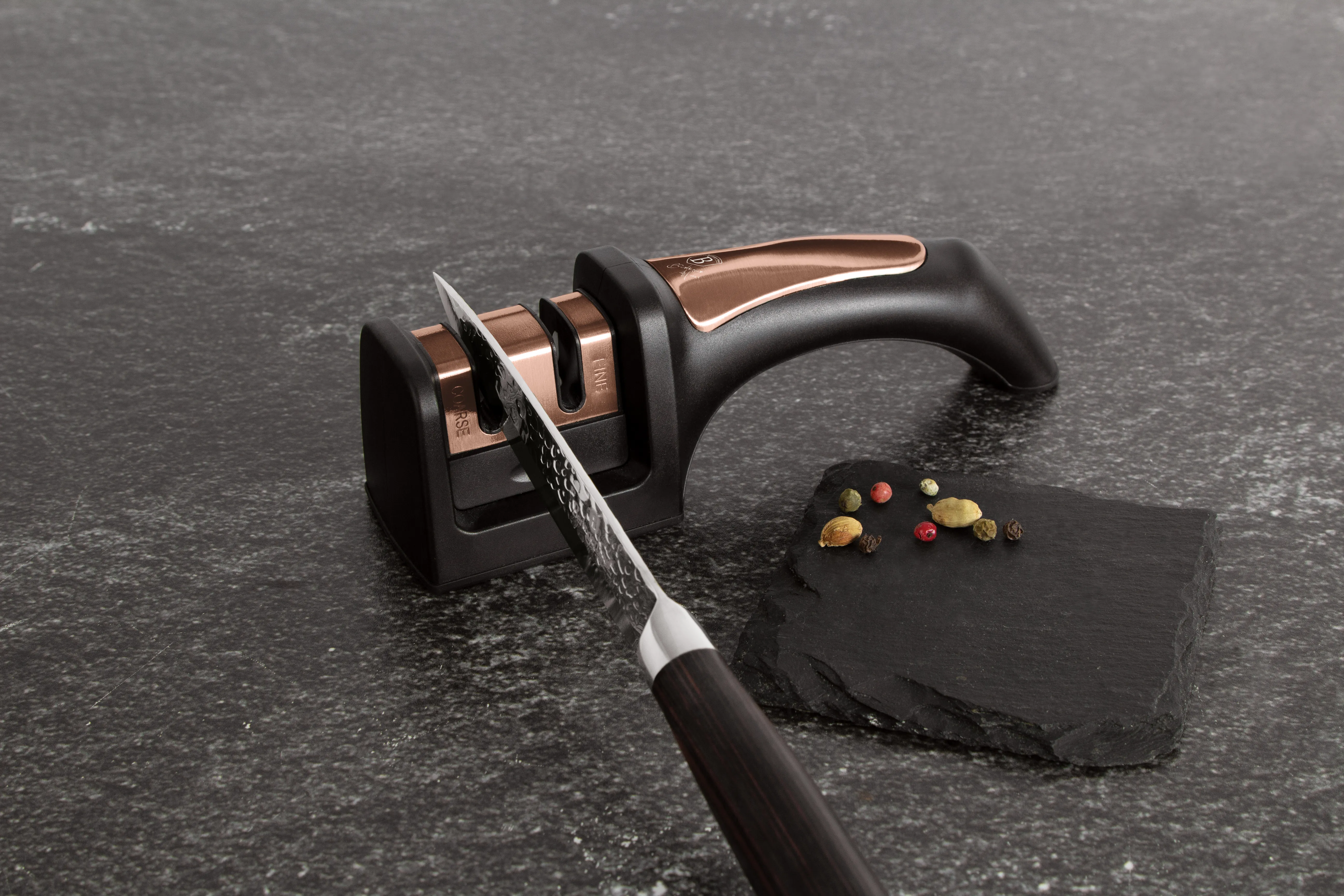 W pierwszym kroku ostrzymy nóż, by w drugim kroku wypolerować i wygładzić jego krawędź, dzięki czemu ostrze będzie bardzo ostre