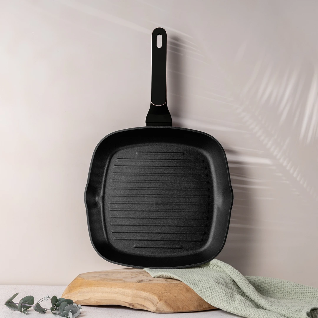 Styl, funkcjonalność i najwyższa jakość w jednym. Patelnia grillowa z kolekcji Black Rose to idealne rozwiązanie dla miłośników grillowanych smaków bez względu na porę roku. Dzięki nowoczesnej powłoce titanPro i eleganckiemu designowi w kolorze matowej czerni z akcentami różowego złota, łączy nowoczesność z praktycznym zastosowaniem.