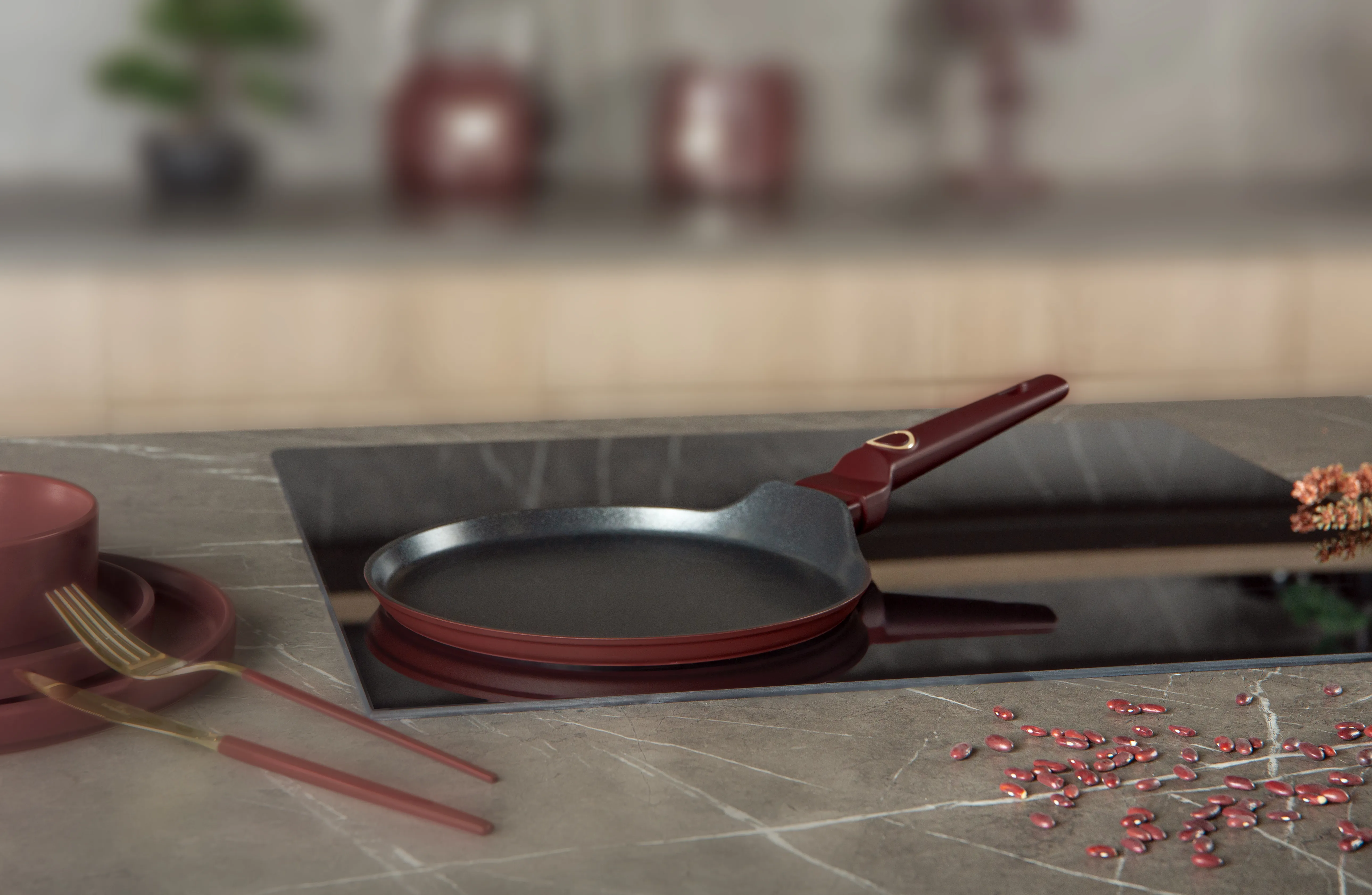 Patelnia wykonana z najwyższej jakości kutego aluminium, posiada wewnętrzną powłokę nieprzywierającą TitanPro, oraz zewnętrzną powłokę z matowym wykończeniem w kolorze matowym borodwym.