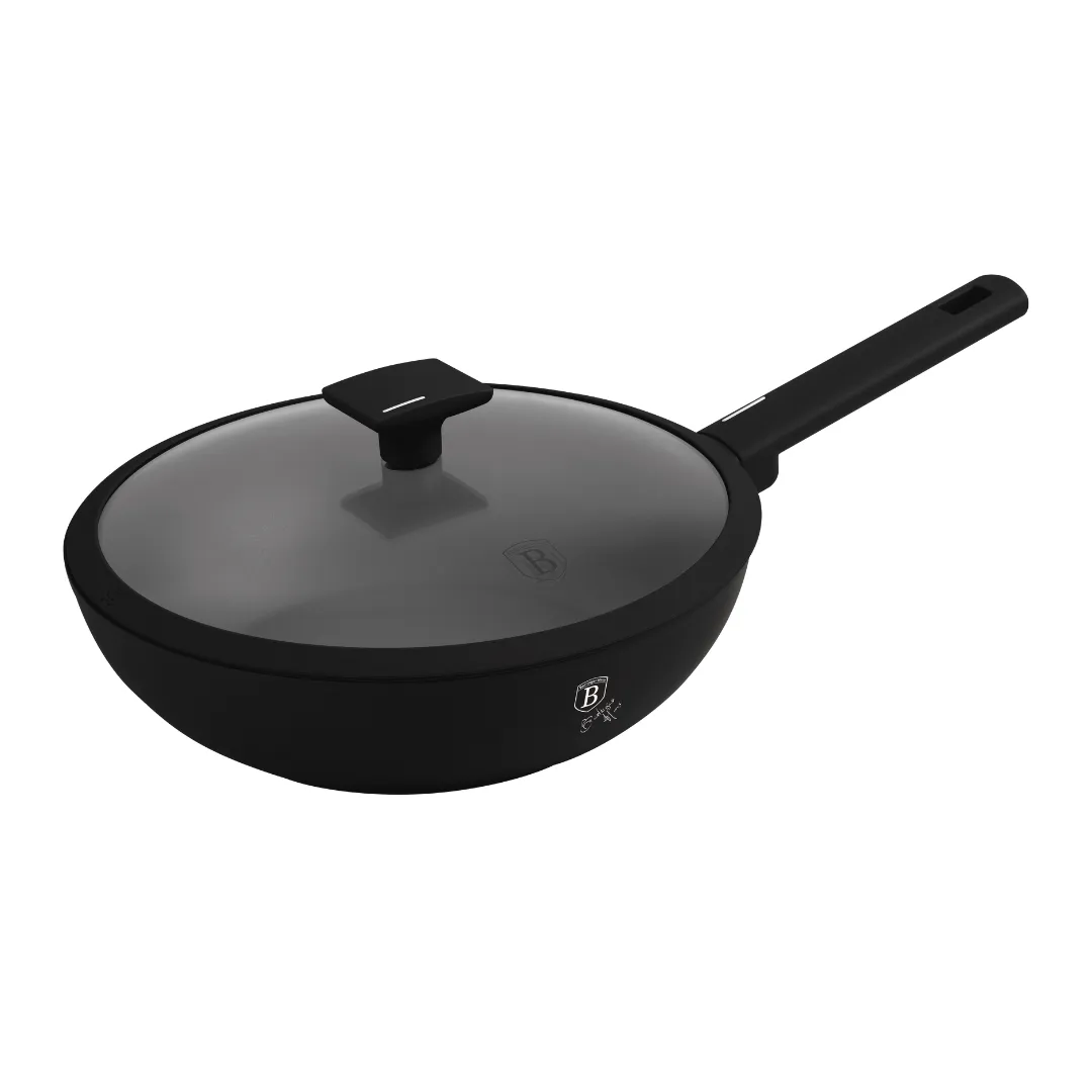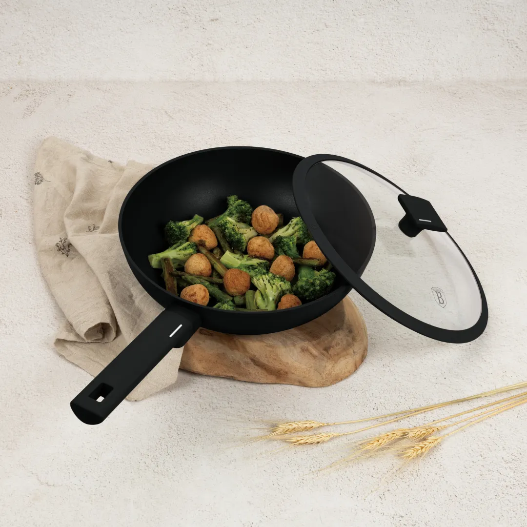 Patelnia wok z pokrywką BerlingerHaus BH-8181 – Matte Black Collection to wyjątkowe połączenie stylowego wzornictwa i wszechstronnych możliwości gotowania. Wykonana z wysokiej jakości kutego aluminium i wyposażona w innowacyjną, 3-warstwową powłokę titanPro, zapewnia równomierne nagrzewanie, nieprzywierającą powierzchnię oraz wyjątkową trwałość – idealna do smażenia, duszenia i gotowania w wysokiej temperaturze.