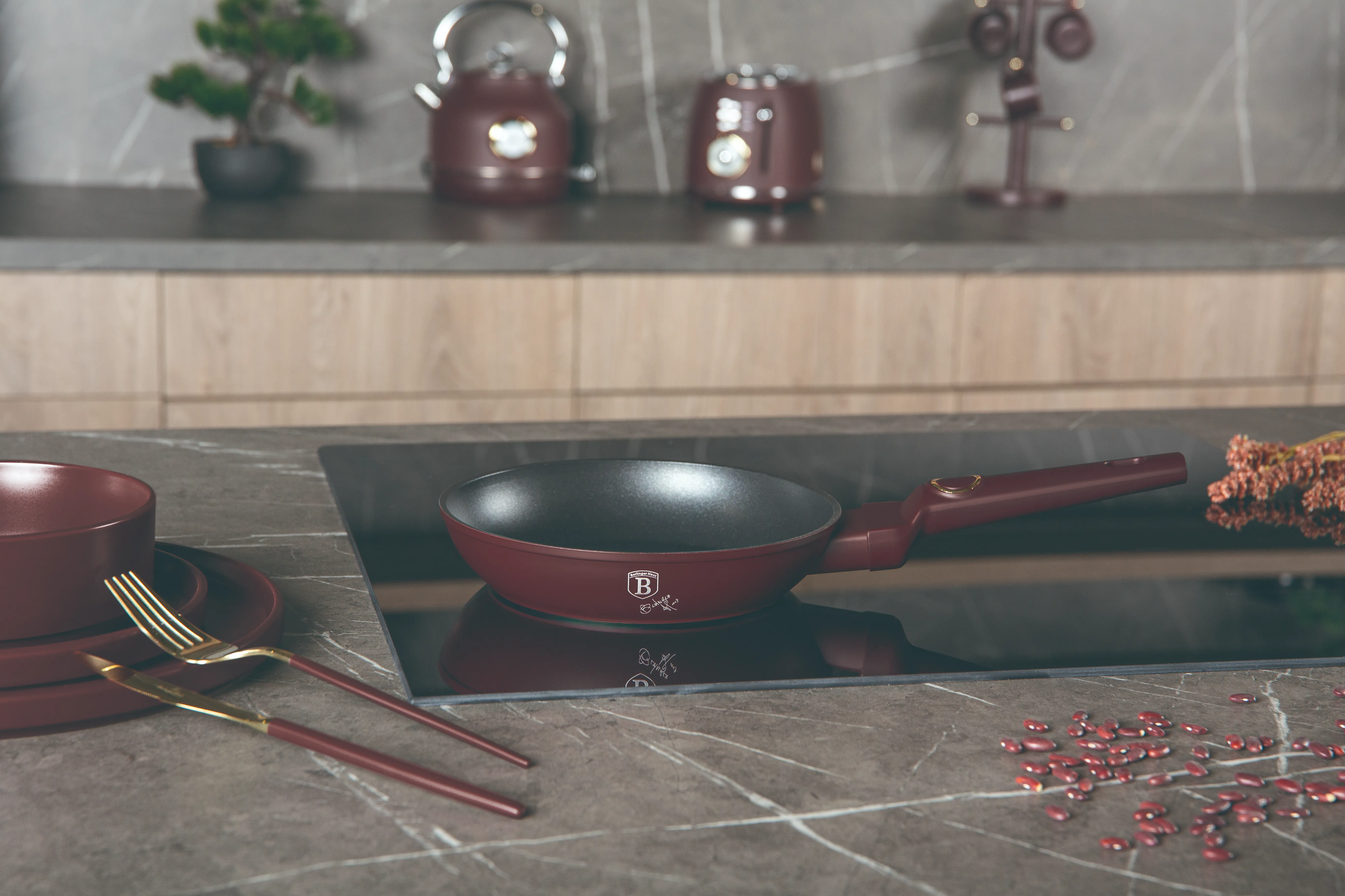 Powłoka zewnętrzna w kolorze BORDOWYM matowym. Te atrakcyjne i modne naczynia wyposażone są standardowo w uchwyty typu SOFT TOUCH (silikon handle).