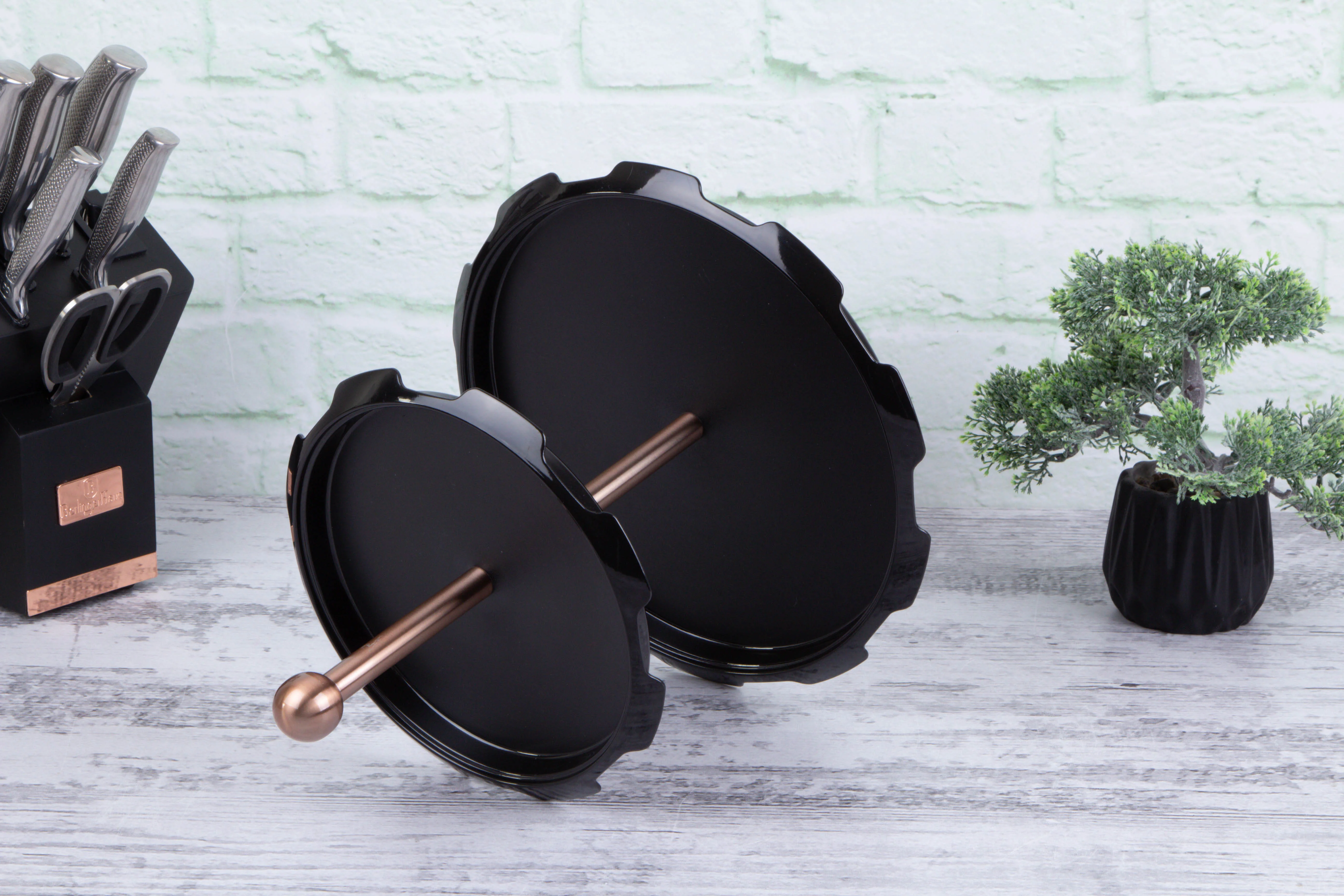 Wyjątkowy design oraz połączenie koloru czarnego z różowym złotem sprawiają, że produkt doskonale prezentuje się na każdym stole oraz kuchni.