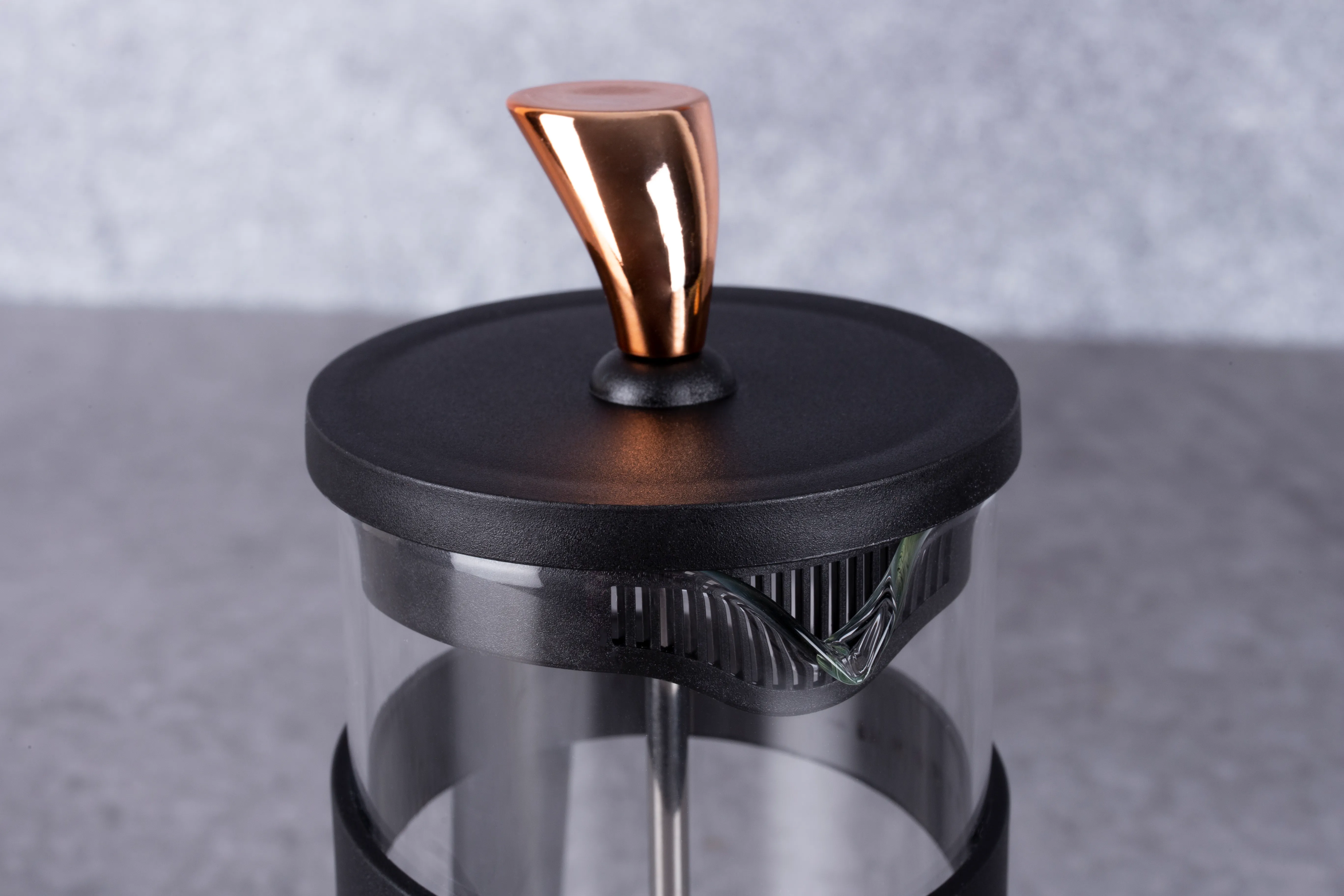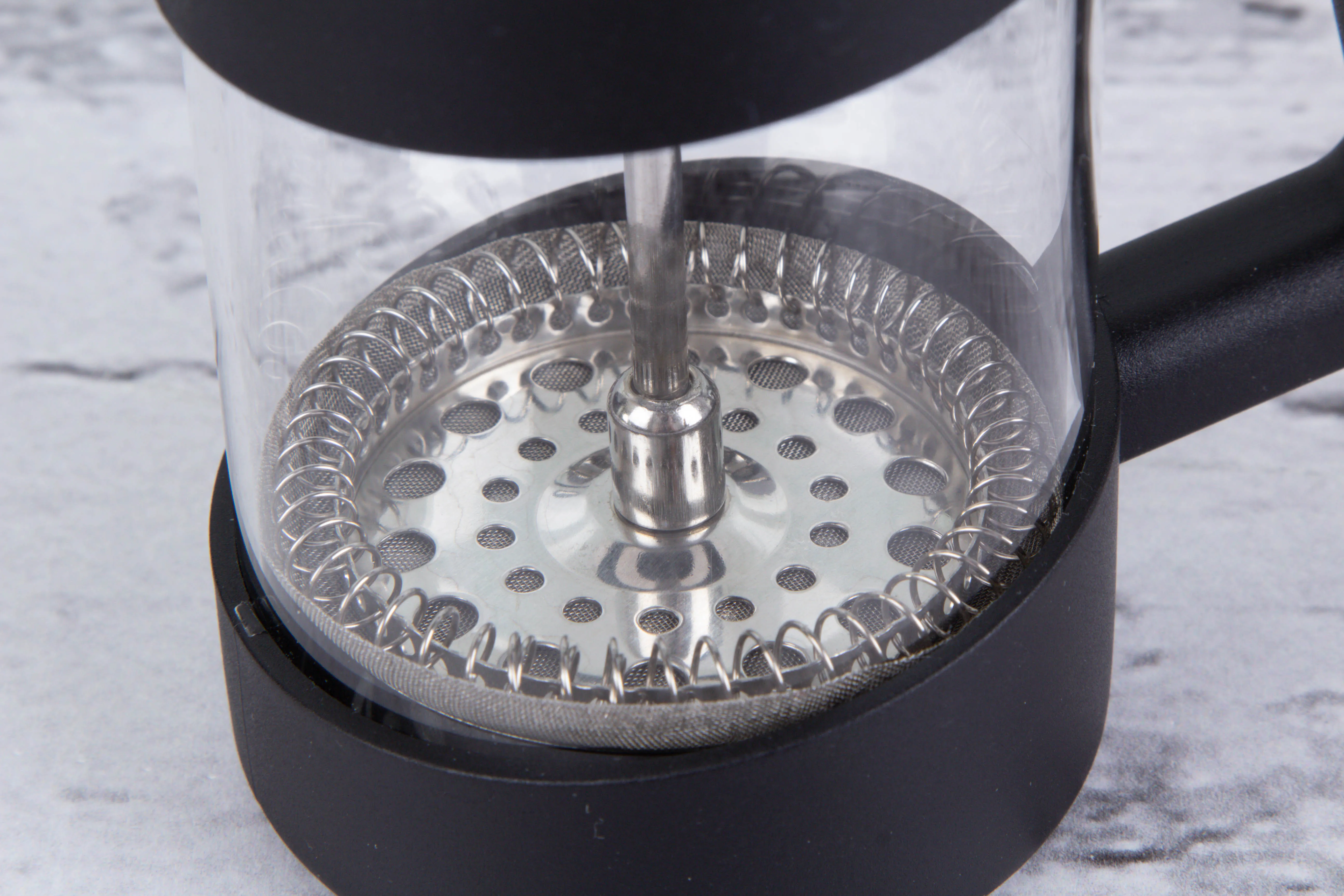 Stalowe sitko z dociskaczem, plastikowa pokrywa w kolorze czarnym i antypoślizgowa, silikonowa podstawka