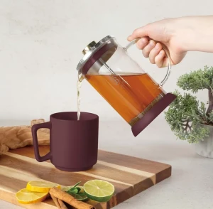 Stalowe sitko z dociskaczem, plastikowa pokrywa w kolorze burgundowym i antypoślizgowa, silikonowa podstawka