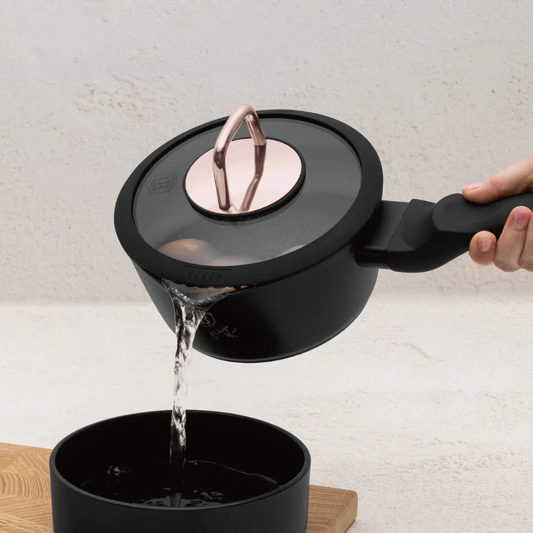 Pokrywki dołączone do zestawu wyprodukowano ze szkła hartowanego wykończonego odpornym na ciepło silikonem, natomiast przybory kuchenne powstały z nylonowego materiału, nadającego im plastyczność, mniejszą kruchość oraz wytrzymałość na wysokie temperatury. Nie rysują powłoki naczyń oraz nie przenoszą zapachów żywności.