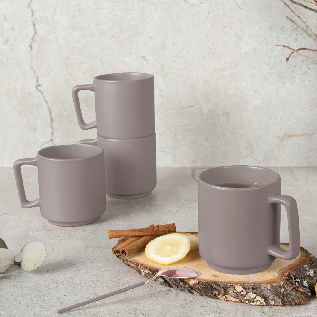 Każdy kubek ma pojemność 300 ml i wymiary 9,5 x 9 cm, co sprawia, że świetnie nadaje się do kawy, herbaty i innych ulubionych napojów. Wyprofilowane spody umożliwiają bezpieczne ustawianie kubków jeden na drugim – wygodne i oszczędzające miejsce rozwiązanie w każdej kuchni. - Stylowe wykończenie – matowy odcień taupe